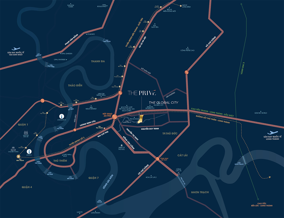 Tọa lạc tại khu đô thị Nam Rạch Chiếc, phường An Phú (TP. Thủ Đức), The Privé nằm trên trục Song Hành cao tốc TP.HCM – Long Thành – Dầu Giây, kết nối trực tiếp Thủ Thiêm – Quận 1 và các trục huyết mạch Mai Chí Thọ, Xa Lộ Hà Nội, Vành đai 2. Đây là tâm điểm “Downtown mới” của TP.HCM với tầm nhìn 360° và lợi thế ven sông Giồng Ông Tố hiếm có.